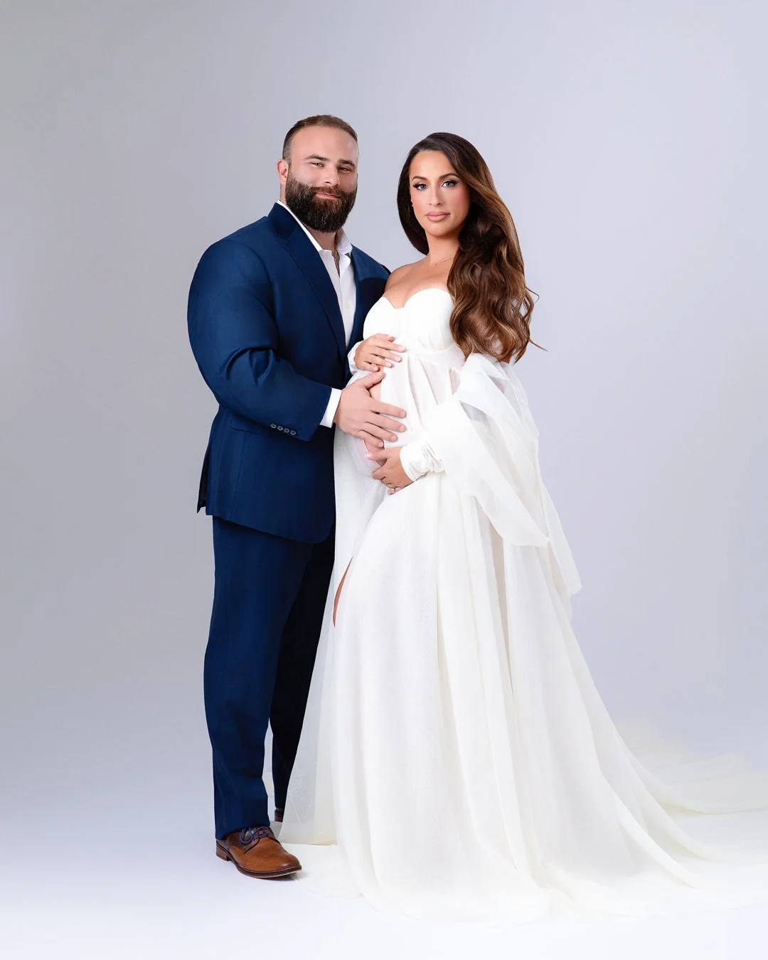 Your session includes access to an exclusive studio wardrobe featuring couture maternity gowns, flowing fabrics, and statement pieces selected for their elegance and versatility. Many gowns feature adjustable tie-backs, corsetry, and stretch fabrics designed to beautifully accommodate a wide range of body types.